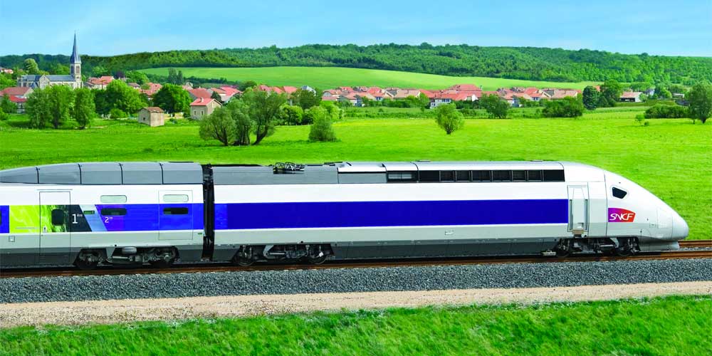 The TGV between Paris and Lyon reaches a speed of 180 miles per hour.